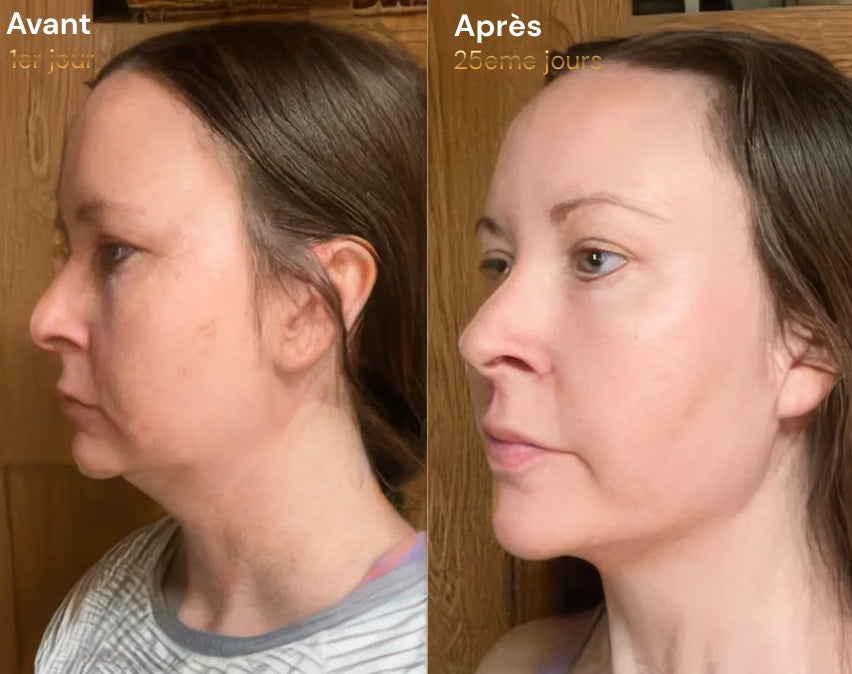 Travailler un seul côté du visage révèle rapidement un effet liftant, un visage moins gonflé et des contours plus définis. Terminez les deux côtés, appliquez votre sérum et profitez d’un teint plus éclatant.